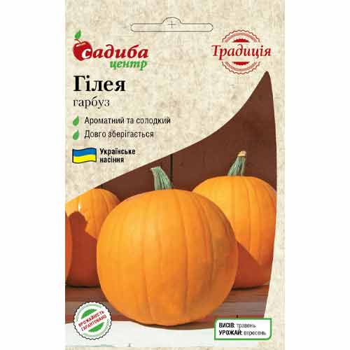Гарбуз Гілея - цікавий середньоранній гарбуз, який нагадує звичайний, а всередині - мускатний. Плоди масою 6-9 кг, тонкошкірі, світло-коричневі з рожевим відтінком, м'якоть темно-помаранчева, соковита, цукриста, ароматна і солодка. Вирощують через розсаду або прямим посівом у ґрунт на глибину 3-4 см у травні-червні. Підходить для вживання у свіжому вигляді та для переробки. Сорт відносно стійкий до борошнистої роси і зберігається протягом цілого року!