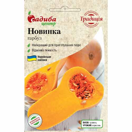 Гарбуз Новинка - середньопізній, мускатний сорт. Термін дозрівання 110-120 днів. Рослина сильноросла. Плоди видовжено-циліндричні, булавоподібні, помаранчеві з рожевим відтінком. Кора тонка, шкіряста. Маса плоду 3-7 кг, м'якоть помаранчева, солодка, соковита. Смакові якості та товарність високі. Сорт посухостійкий, толерантний до борошнистої роси. Рекомендується для споживання у свіжому вигляді, для тушкування, консервування, приготування дитячого пюре. Відрізняється гарною транспортабельністю і придатністю до тривалого зберігання до 8 місяців.