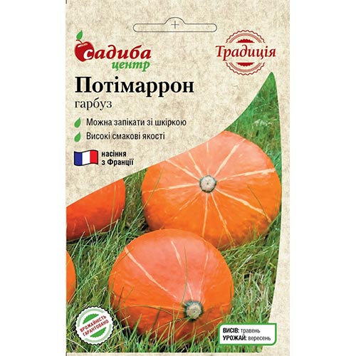 Гарбуз Потімарон - це дуже потужна гарбузова ліана з великим округлим листям і довгими, 10-12 м, стеблами. На одній рослині формується до 10 невеликих (1,5-2 кг), округлих, чітко сегментованих оранжево-червоних плодів. М'якуш гарбуза багатий каротином, яскравий, щільний і солодкий. Потімарон відрізняється не «гарбузовим» смаком, а добре помітним присмаком каштану та легкими нотками горіха і не має специфічного гарбузового аромату. М'якуш не дуже соковитий, не волокнистий і консистенцією більше нагадує картоплю, ніж гарбуз. Має гарний солодкий смак та аромат. Особливістю цього дивовижного ґатунку є те, що його можна не чистити перед приготуванням!