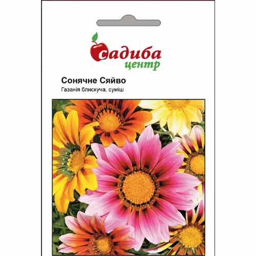 Газанія Сонячне сяйво – трав’янистий однорічник із великими, до 7-10 см в діаметрі, бутонами. Пелюстки забарвлені у білий, жовтий, помаранчевий та рожевий колір і прикрашені широкими смужками посередині. Висота культури 30 см, цвіте вона з середини літа аж до самих холодів. Її найчастіше вирощують у бордюрах, на рабатках та кам'янистих гірках.
