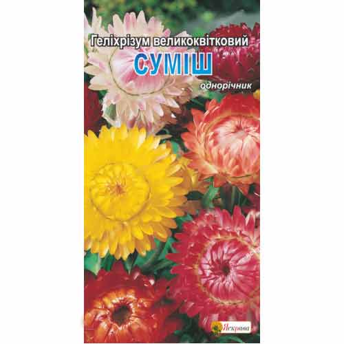 Геліхрізум великоквітковий, суміш забарвлень – дивно красивий сухоцвіт для прикраси клумб, рабаток, балконних ящиків і використання для складання зимових букетів. Друга назва геліхрізум – безсмертник, рослини довго зберігають форму і насичене забарвлення при складанні сухих композицій. Великі махрові кошики безсмертника пофарбовані в білі, солом'яно-жовті, оранжево-рожеві, насичено червоні відтінки.