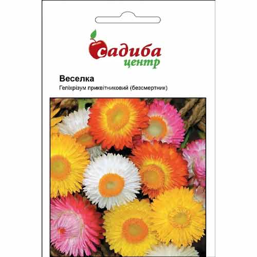 Геліхрізум Веселка – суміш карликових однорічників. Кущики розлогі, до 40 см заввишки. Суцвіття-кошики бувають білого, рожевого, жовтого, червоного та помаранчевого відтінків. Діаметр бутонів – до 2 см. Цвітіння рясне, починається в липні. Культура підходить для озеленення клумб та рабаток. Це гідний варіант на зріз та в якості ефектного сухоцвіту.
