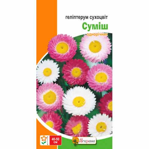 Геліптерум Сухоцвіт, суміш забарвлень – це чарівний сухоцвіт з кошиками приємних забарвлень. Язичкові пелюстки розташовані в кілька рядів, обрамляють яскраво-жовту серединку. Оригінальні квіти прикрашають літні клумби, взимку з них можна робити довговічні сухі букети. Пелюстки геліптерума довго зберігають яскраве забарвлення.