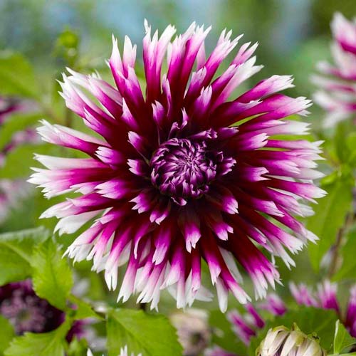Жоржина Алауна Клер Обскур (Dahlia Alauna Clair Obscur) – бахромчастий сорт із градієнтним забарвленням пелюсток. У середині бутон насиченого фіолетового кольору, а на кінчиках – білосніжний. Культура також вражає величиною своїх бутонів – при повному розкритті їх діаметр становить 20 см. Висота квітконосів сягає 110-120 см. Цей сорт настільки виразний, що буде добре виглядати навіть у монопосадках. А іще його можна розмістити на тлі зеленого газону або хвойних чагарників.
