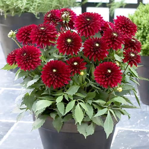 Жоржина Фріволоус Глоу – ефектна крихітка насиченого винно-бордового відтінку. Її висота не перевищує 35 см, а діаметр пишних кулястих бутонів досягає 5-10 см. У декоративний період вони мають легкий солодкий аромат. Квітки дуже ошатно виглядають на тлі малахітової зелені, тому жоржини привернуть всі погляди в будь-якому місці – і на клумбах, і посеред газону, і в контейнері. Цвітіння тривале й рясне, в хороших умовах – повторне.