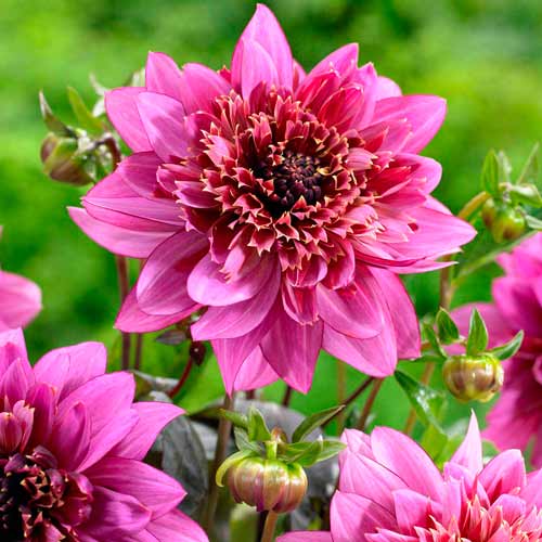Жоржина Мамбо (Dahlia Mambo) – це декоративний багаторічник, який вигідно відрізняється від своїх побратимів тим, що зимує у ґрунті. Висота кущиків до 60 см, це дає можливість використовувати їх у мікспосадках, для створення рабаток навколо високорослих культур. Квіти махрові. Зовнішні пелюстки широкі, загострені, рожевого кольору. Внутрішні дрібні з трьома гострими верхівками, забарвлені на тон темніше. Центр бутонів бордово-фіолетовий.