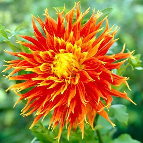 Жоржина Шоу Енд Телл — справжнє буйство фарб у вашому квітнику. Це торочкуватий сорт, виведений американськими селекціонерами. Розмір чаші досягає 25 см. Довгі, загострені, розсічені на кінцях пелюстки надають квітці пишність і легкість. Забарвлення вишукано строкате. Завдяки поєднанню яскраво-оранжевого і сонячно-жовтого, пелюстки здаються охопленими полум’ям. Цвіте з липня по вересень. Висота куща нерідко перевищує 120 см.