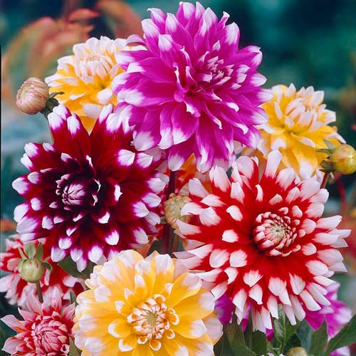 Жоржина Вайт Топ (Dahlia White Top Mixed) – мікс двоколірних сортів. На міцних стеблах до 80-100 см заввишки розпускаються великі бутони жовтого, червоного, рожевого або бордового кольору. Всі верхівки пелюсток прикрашені білим мазками. Цвітіння починається у другій половині літа і триває майже до осені. Жоржини можна посадити разом, і тоді ви отримаєте ошатну святкову клумбу. Також вони добре виглядають на тлі хвойників або газону.