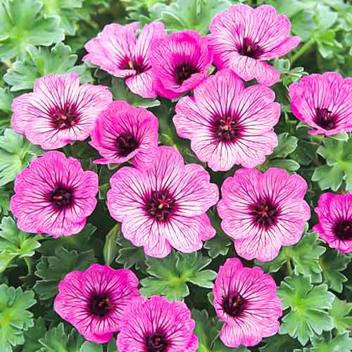 Герань Балерина – прекрасний багаторічник з виразними бутонами. Ніжні пелюстки забарвлені в яскравий рожево-ліловий відтінок, їх, немов паморозь вокривають тонкі темні прожилки, з якими за кольором гармонує темна серединка. Зелень різьблена, яскраво-зелена. Кущики зростають до 20 см, квітнуть рясно в червні – липні. Замовляйте саджанці герані Балерина – вона буде доречна в альпінаріях та кам'янистих садках, прикрасить балкони й веранди.