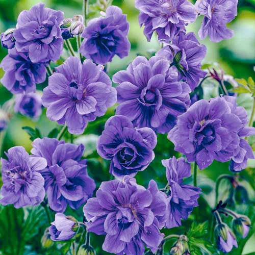 Герань садова Пленум (Geranium Plenum) – невеличкий, але розлогий багаторічник, його висота досягає 30 см, а діаметр – півметра. Листя зелене, ажурне й витончене. З кінця весни на пагонах утворюється безліч ніжних бутонів діаметром до 4-5 см. Їх зовнішній вигляд нагадує троянди фіолетового відтінку. Рослина декоративна майже до осінніх заморозків. Її використовують у будь-яких квітниках, рабатках та на альпійських гірках, вирощують у контейнерах.