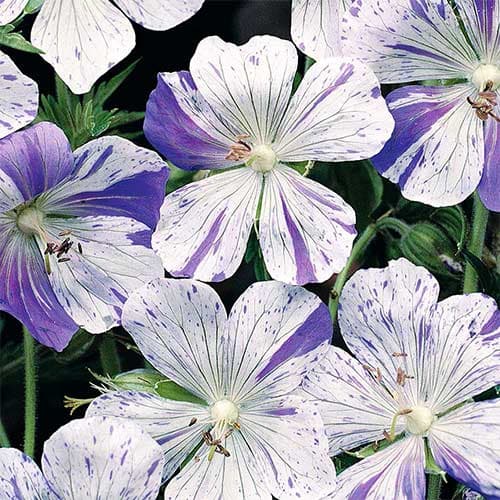 Герань садова Спліш Сплеш (Geranium Splish Splash) – блакитний сорт із строкатими пелюстками. Після посадки швидко формує невисокі, сильно гіллясті розлогі кущі з численними квітконосами. Бутони блідо-блакитні, немахрові, з яскраво-блакитним пір'ястими смужками на пелюстках, зібрані в пухкі суцвіття. Цвітіння безперервне в травня по вересень. Не потребує зимового укриття і додаткового догляду. Ідеальний сорт для створення природних ландшафтів, озеленення громадських просторів, зонування території та оформлення багаторічних квітників.