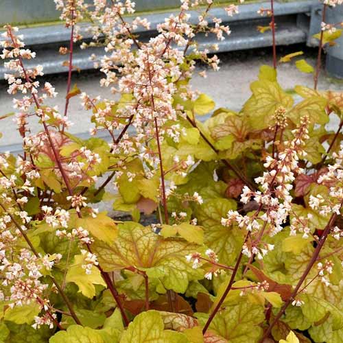 Гейхера Корал Белс – оригінальний багаторічник з жовто-зеленим листям та темними ефектними прожилками. На початку літа рослина викидає квітконоси з безліччю білих бутончиків й відразу стає схожим на салют. Таке свято відбуватиметься на ваших клумбах аж до серпня. Висота чагарничків сягає 45 см й приблизно на стільки ж вони розростаються завширшки, тому не варто садити рослини дуже близько одну до одної. Багаторічник прекрасно підходить для декорування тінистих куточків саду, добре поєднується з іншими сортами.