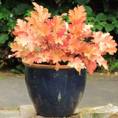 Гейхера Мармелад – приголомшливо красивий багаторічник з листям, яке за кольором дійсно нагадує ці солодкі ласощі, – персиково-червоним. Кущі досить великі, по висоті й діаметру можуть сягати 45 см. Рослина квітне в червні – липні, викидаючи на довгих квітконосах суцвіття, які складаються з безлічі дрібних світлих бутончиків. Якщо на вашій ділянці багато крупномірів, під кронами яких квіти зростають не дуже охоче, то краще за все придбати саджанці гейхери Мармелад. Культура прекрасно поєднується з іншими сортами, ефектна в монопосадках та зберігає декоративність більше 6 місяців на рік.