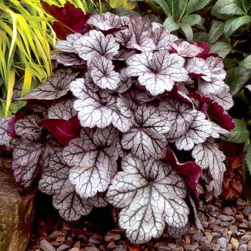Гейхера Вельвет Найт – багаторічна культура з абсолютно приголомшливим забарвленням листя. Воно велике, фігурне, забарвлене в темний винний відтінок, а верхня сторона листової пластини покрита білою памороззю. У другій половині літа на довгих квітконосах формуються рихлі суцвіття білого кольору. Висота рослини складає 20-50 см, а діаметр – 25-30 см. Купуйте саджанці гейхери Вельвет Найт – вона ефектно виглядає в одиночній посадці, прекрасно доповнює інші сорти з контрастним забарвленням листя.