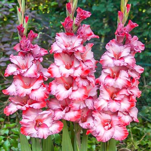 Гладіолус великоквітковий Грейхаунд утворює колосовидне стебло з 20−25 бутонами. Квітка оформлена рожевим горлом і кармінною облямівкою. Основний тон пелюсток біло-рожевий. Сорт ефектно виглядає в букетах і довго стоїть у вазі, поступово розкриваючи бутони.