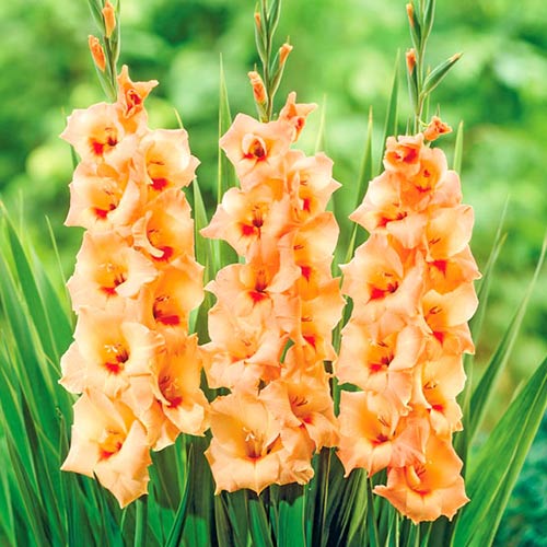 Гладіолус великоквітковий Овація формує колосовидне стебло, яке покрите безліччю бутонів. Поступово вони розкриваються помаранчевими квітами, ніби підсвіченими зсередини сонцем. Рослина розкішно виглядає в букетах і вирощується на зрізання.