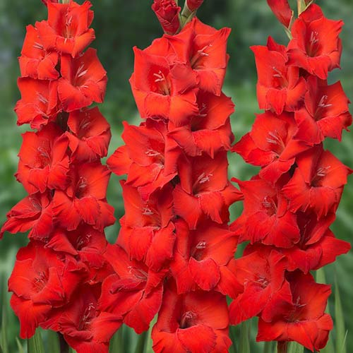 Гладіолус великоквітковий Ред Б’юті - розкішний крупноквітковий сорт, який формує на стеблі до 25 бутонів. Гофровані пелюстки мають вогненно-червоний колір. Сорт ефектно виглядає в букетах, довго стоїть у вазі та часто вирощується на зрізання.