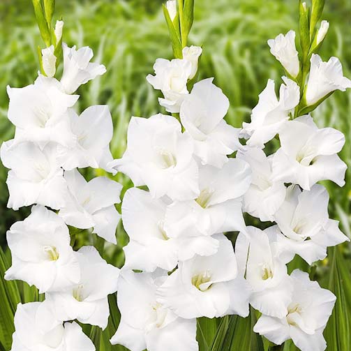 Біла з кремовим горлом квітка, бутони зеленуватого кольору, гофрований край, форма суцвіття у вигляді метелика – ви представили цю вишукану красу? Але ж ви можете насолодитися нею, купивши цибулини гладіолуса Вайт Просперіті в інтернет-магазині «GradinaMax»! Високий квітконос (90-110 см), здорове мечоподібне листя, колосовидна форма суцвіття – все це робить сорт бажаним як на клумбі, так і у вазі.