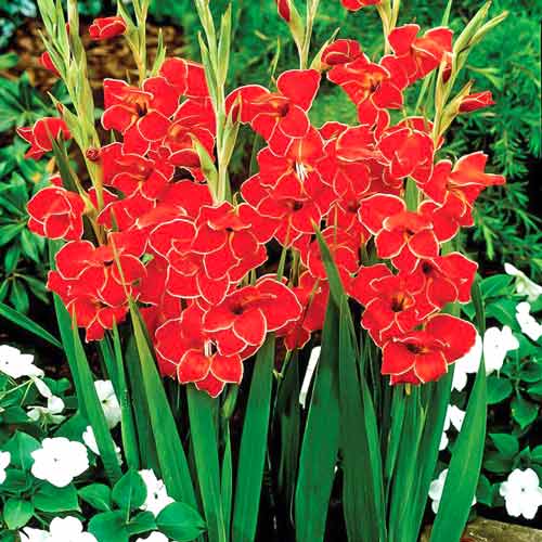 Гладіолус міні Атом – ефектна та пекуча, пристрасна, як фламенко, багаторічна бульбоцибулинна квітка. Пурпурово-червоні блискучі пелюстки химерно вигнуті, сліпуче-біла облямівка робить їх виразнішими, ніби намальованими.