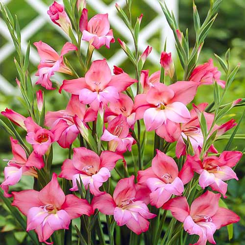 Гладіолус міні Шарм – це чудовий сорт міні-гладіолуса з витонченими різьбленими квітками мінливого рожевого кольору. Чудова особливість забарвлення – тонко гофровані пелюстки мають різну насиченість тону. По краях вони малиново-рожеві, а ближче до серединки білі, з пурпуровими прожилками.