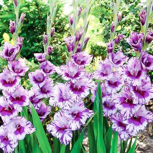 Гладіолуси Пассос – ось які бульбоцибулинні вам потрібно замовити, щоб привернути до клумби загальну увагу. Загальна довжина квітконосу становить 120-130 см, довжина одностороннього колоса – 60 см. Діаметр бутонів – 12 см. Вони лавандово-бузкового відтінку, більш темні біля горла, пурпурно-фіолетові мазки також прикрашають краї пелюсток. Цвіте культура в серпні-вересні. Відмінно підходить для створення чоловічих букетів.