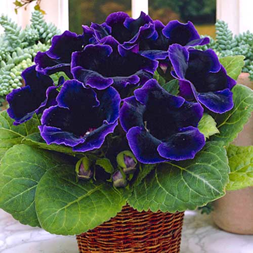 Кімнатна рослина прекрасно почуває себе на світлому і теплому підвіконні. Квіти великі, бархатисті, фіолетового кольору з бордовим відтінком, пелюстки з хвилястими краями. Горло біле з фіолетовими смужками і темним крапом. Листя м'ясисте, опушене, висота рослини до 25 см, діаметр квітки – 8 см. Купіть бульби глоксинії Віолацея в інтернет-магазині «GradinaMax», нехай у вас буде яскравий сад на підвіконні.