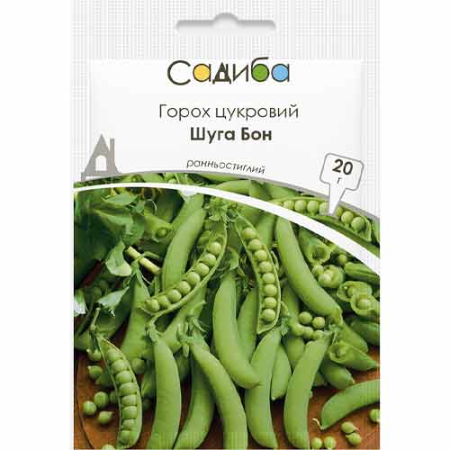 Горох цукровий Шуга Бон – середньоранній сорт. Солодкі соковиті горошини стануть улюбленими ласощами для дітей. Вони дозрівають за 50-60 днів. Лопатки ніжні, без пергаментного шару, довжиною 7-9 см, кожна містить 6-8 бобів. Підходять для вживання в свіжому вигляді, кулінарної обробки та заморожування.