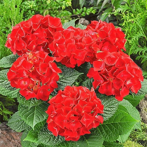 Гортензія крупнолиста Вогняна краса – багаторічний чагарник з незвичайними вогняно-червоними шапками суцвіть. Бутони невеликі – близько 3 см, а діаметр суцвіть сягає 15-20 см. Чагарник зростає до 2 м у висоту і майже на стільки ж розростається крона завширшки. Замовляйте саджанці гортензії крупнолистої Вогняна краса – вони ефектні в одиночних та групових посадках, різні сорти добре поєднуються між собою.