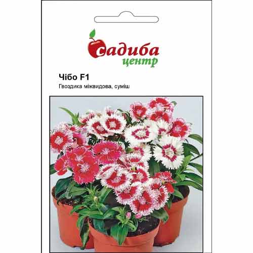 Гвоздика Чібо F1 – суміш низькорослих однорічників різних забарвлень. Трисантиметрові бутони бувають рожевими, білими й двобарвними. Кущики виростають до 20-25 см заввишки і мають такий же діаметр. Культура прекрасно виглядає в горщиках і контейнерах, ефектна в масових посадках і добре гармонує з іншими рослинами. Купуючи суміш насіння гвоздики Чібо F1, ви отримаєте невибагливі й посухостійкі квіти різних забарвлень.