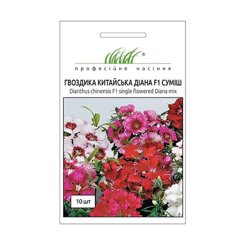 Гвоздика Діана F1 - унікальна рослина з раннім періодом цвітіння, компактним габітусом та гігантськими квітами. Висота рослини 20-25 см. У змісті зібрані різноманітні забарвлення від яскравих однотонних до незвичайних двоколірних. Цвітіння рясне та тривале з початку літа до глибокої осені. У теплиці чи парнику висівають у січні-березні місяці. На постійне місце саджанці висаджують у травні, на відстані 25-30 см. Рослина невибаглива, не боїться заморозків, добре розвивається на відкритих сонячних місцях та легкій півтіні. Використовується для оформлення клумб та бордюрів. Прекрасно виглядає у горщиках та контейнерах.