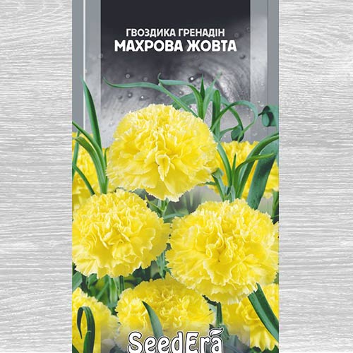Гвоздика махрова Гренадін жовта – це дивовижне садова рослина з тонким пряним ароматом для прикраси клумб і рабаток. Яскраво-жовті махрові квіти з бахромчатими краями дуже ефектно виглядають на клумбі і в букеті. Замовити насіння махрової жовтої гвоздики Гренадін можна для використання в зрізку при складанні букетів-висота стебел рослини становить від 40 до 60 см.
