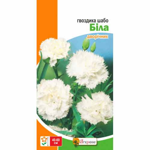 Гвоздика Шабо біла - напрочуд ніжна квітка. Висота куща 30-50 см, квітка махрова, біла, до 7 см в діаметрі. Різьблені білі пелюстки на тлі сизо-зеленого листя виглядають дуже святково та ефектно. І настільки вони гарні та ароматні, що гідні сяяти у весільному букеті нареченої. Навіть на клумбі гвоздики не губляться серед інших кольорів. Навпаки, чиста краса білих суцвіть гармонує практично з усіма культурами. Холодостійка і невибаглива гвоздика Шабо біла підкорить вас з першого погляду.