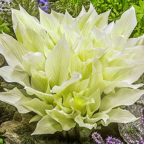 Хоста Вайт Фезер — один з найефектніших сортів. Вузьке гофроване листя має світло-салатовий колір навесні. До середини літа стає зеленими з білими смужками. У липні-серпні кущ утворює дзвоникоподібні лавандові квіти.
