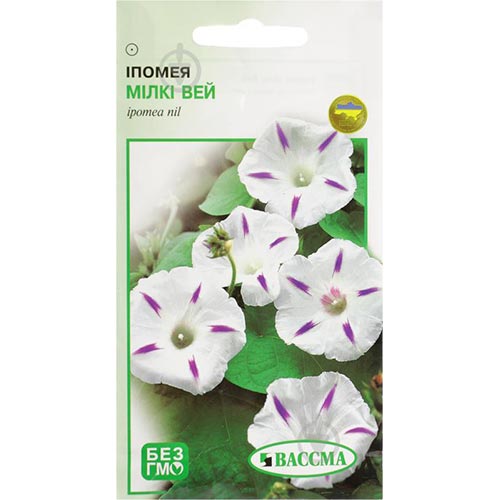 Іпомея Мілкі Вей - сильно рослий однорічник з пишними воронкоподобнимі білими квітками з рожевими смужками. При хороших умовах вирощування цвітіння рясне і триває протягом декількох місяців. Особливість цієї квітки в тому, що розкривається вона тільки вдень, при яскравому освітленні. Замовляйте якісне насіння в нашому інтернет-магазині всього за кілька хвилин.
