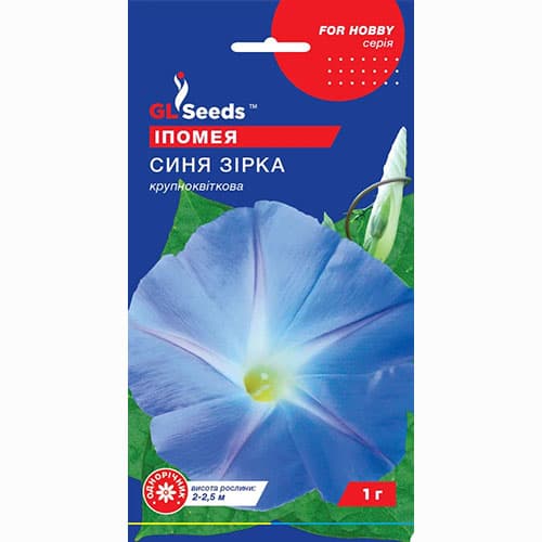 Іпомея Синя зірка – трав'яниста ліана для вертикального озеленення з великими, небесносиними квітками. За сезон за сприятливих умов її пагони можуть зростати до п'яти метрів завдовжки! Обвиваючись навколо опор, створять шикарну квітучу стіну, вкриють собою альтанку або веранду, врятують у спеку від сонячного проміння. Умови вирощування. Перед сівбою рекомендується на добу замочити насіння. Сходи з'являються на 7-14 день за оптимальної температури 18°С. Рослина не вибаглива до умов вирощування. Висадка на постійне місце, коли мине загроза заморозків.
