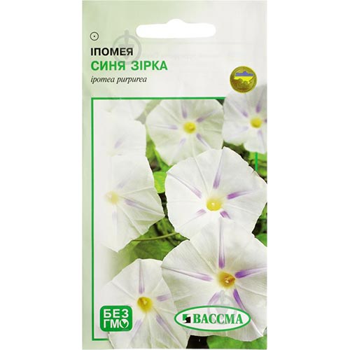 Іпомея Синя Зірка – це однорічна витка рослина, що досягає висоти 2-3 м. В Англії квітку називають «слава ранку», оскільки вона відкривається рано вранці. Сорт відрізняється небесно-синім забарвленням і світло-фіолетовими прожилками у вигляді зірки всередині кожної воронкоподібної квітки. Діаметр розкритого бутона – 5-6 см.