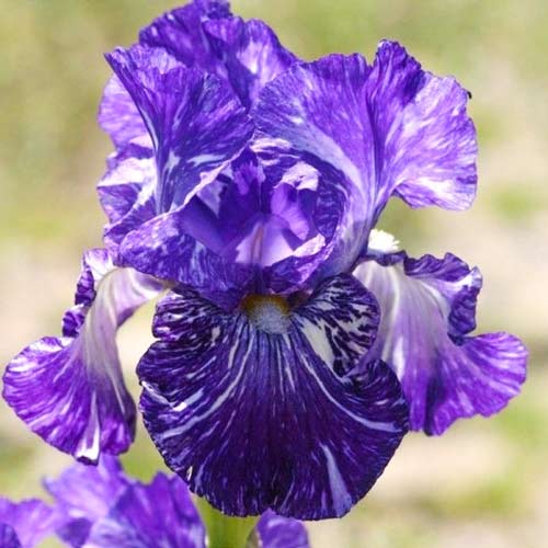 Ірис називають садовою орхідеєю за його квітку вишуканої форми і чарівний аромат. Важко уявити сад без цієї рослини! Її сизо-зелене мечоподібне листя, що росте віялом від кореневища, надає декоративності навіть при відсутності цвітіння. Великі квітки розпускаються по черзі на міцних квітконосах заввишки 60-65 см протягом 2-3-х тижнів. Розмір 10-15 см, насичений фіолетовий колір з контрастними білими штрихами, яскраво-жовта борідка з червоним язичком – як можна встояти перед такою красою?