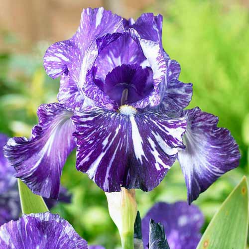 Ірис германський Батік (Iris Batik) – рослина, яка відноситься до бородатих сортів. За форму своїх бутонів її часто називають садовою орхідеєю. Квітка виростає лише до 65 см, але завдяки яскравим контрастним бутонам вона довго не відпускає погляд. На пелюстках гармонійно розташовані два кольори – білий та фіолетово-синій, які сплітаються у дивовижні візерунки. Квітка ідеально виглядає на будь-якій клумбі, добрими сусідами для неї будуть лілійники, півонії та астільби.
