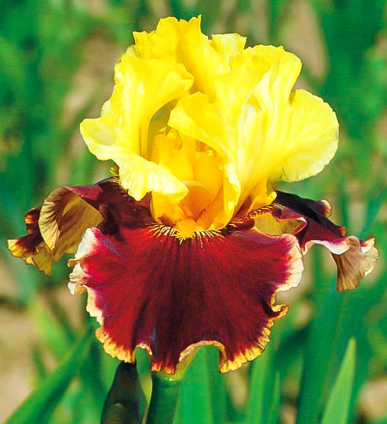 Ірис германський Олл Зет Джаз має рідкісне забарвлення квітконосів і входить до групи «бородавчастих ірисів». Характерна особливість — підстава зовнішніх пелюсток покрита контрастною смужкою волосків. Цвіте в травні-червні. Верхівкові пелюстки жовті. Нижні фоли мають винно-бордовий колір. Борідка — яскраво-червона.