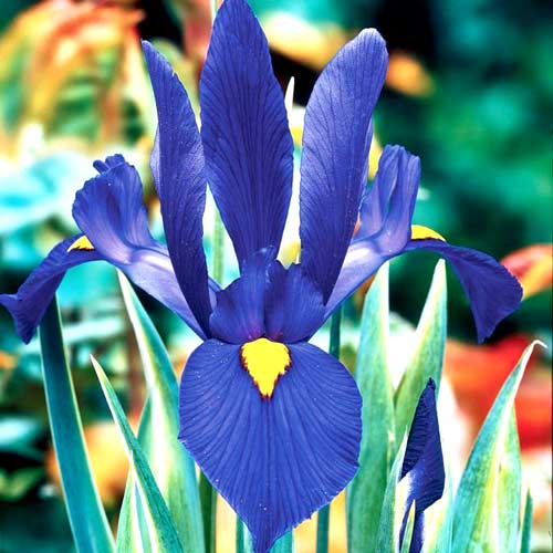 Ірис голландський Блю (Dutch Iris Blue) – цибулинний багаторічник із яскравими синіми квітами. Глибокий колір пелюсток іще більше підкреслює світла смужка та сонячно-жовта серединка. По формі бутони нагадують невеличких пташок з розкритими крилами. Квітконоси безлистяні, міцні, їх висота дорівнює 70 см, на кожному формується по одній квітці. Іриси чудово виглядають на клумбах, їх використовують для вигонки та зрізки. Пік декоративності розтягнутий 1-2 місяці.
