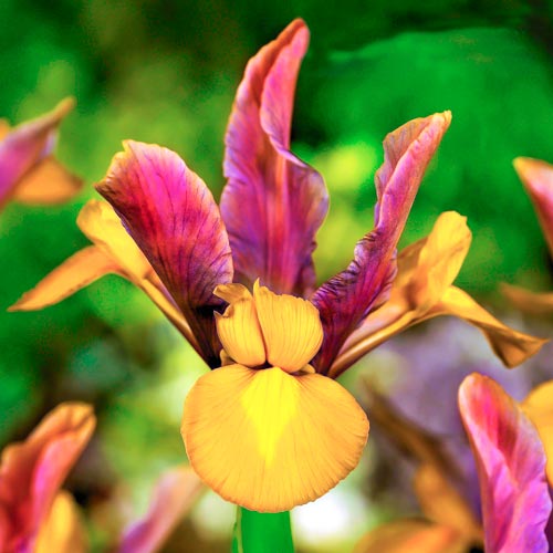 Ірис голландський Бронз (Dutch Iris Bronze/Purple) – цибулинний багаторічник із дійсно королівським забарвленням. У нього прямостоячі міцні стебла до 50-60 см заввишки і довге вузьке зелене листя. На квітконосах розпускаються бутони, дещо схожі на дивних метеликів. Верхні пелюстки зафарбовані у насичений фіолетовий колір, а нижні – жовто-помаранчеві, майже бронзові. Цвітіння припадає на травень – червень. Квітка підходить для прикрашення весняних клумб, міксбордерів та альпінаріїв.