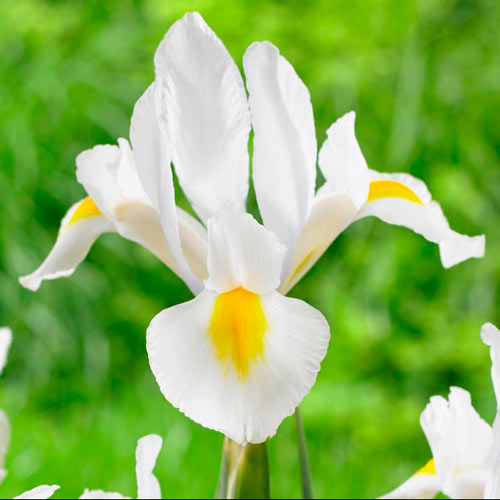 Ірис голландський Вайт (Dutch Iris White) – цибулинний багаторічник, який робить клумби дуже ніжними. Його висота досягає 60 см, квітконоси міцні, не хиляться під вагою бутонів. Пелюстки сніжно-білі із яскраво-жовтими «краватками». Цей вид рослин має не кореневище, як інші, а витягнуту цибулину, розмножується діленням гнізд. Використовується для вигонки на зрізку та озеленення.