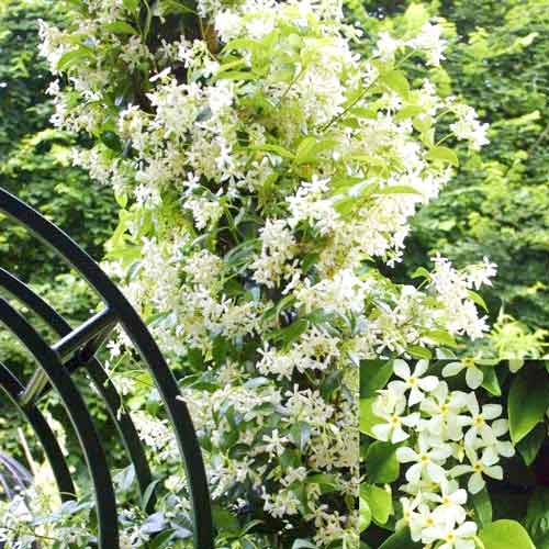 Жасмин Зірчастий – вічнозелена ліана, яка може витягуватися до 10 м у висоту. На тлі смарагдової зелені листя особливо ефектно виглядають невеликі білі квіточки-зірочки. Під час цвітіння в березні-квітні вони видають приємний і досить сильний жасминовий аромат. Рослина культивується в контейнерах, формується на шпалері. Її крону можна зробити пірамідальною, а при правильній регулярній обрізці навіть перетворити ліану на чагарник.