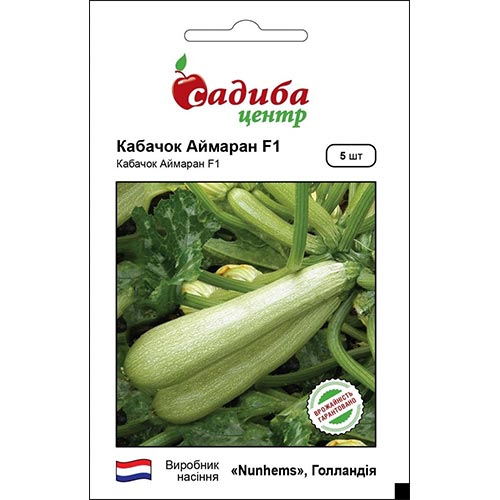 Кабачок Аймаран F1 – ранній гібрид білоплідного кабачка, період дозрівання 35-40 днів. Високоврожайний гібрид із тривалим періодом збирання. Для вирощування у відкритому ґрунті. Дуже добре переносить спеку та стресові умови.