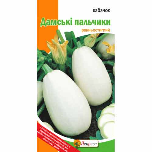 Кабачок Дамські пальчики – це сверхранній сорт, готовий до збирання через 35-40 днів. Кущі компактні, плоди світло-зелені, циліндричні, довжиною до 20 см. Основна мета вирощування цього сорту – велике насіння, яке використовуються у лікувально-профілактичних цілях. Придатний для вирощування в плівкових теплицях і у відкритому ґрунті.
