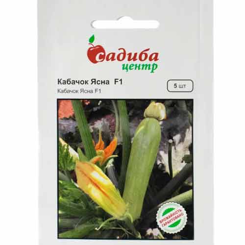 Кабачок Ясна F1 – кущовий високопродуктивний гібрид із раннім терміном дозрівання. Перші плоди ви зберете вже за 40-45 діб. Рослини компактні, відкриті, з короткими міжвузлями, тому збирати кабачки дуже легко. Вони красиві, циліндричної форми із привабливою світло-зеленою шкіркою. М'якоть біла, з ніжним смаком та маленькою насіннєвою камерою. Плоди підходять для свіжого ринку та переробки.