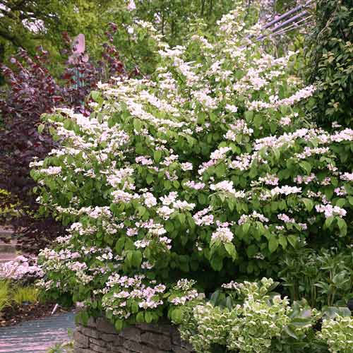 Калина Пінк Б’юті – дивна садова красуня до 1,5 м заввишки. Її можна формувати і як деревце, і як чагарник. Листя насичено-зелене, довгасте, злегка нагадує лаврове. Восени воно міняє своє забарвлення на розкішне бордо та бронзу. Цвітіння починається наприкінці весни й триває близько місяця. У цей період на пагонах розпускаються ніжні біло-рожеві суцвіття, які складаються з безлічі дрібних бутонів. Вони виділяють чарівний приємний аромат, а наприкінці літа перетворюються на кетяги ягід-намистин. Купуйте саджанці калини Пінк Б’юті й висаджуйте її в солітерних посадках, як акцент в окремому куточку саду або для декорування загорож.