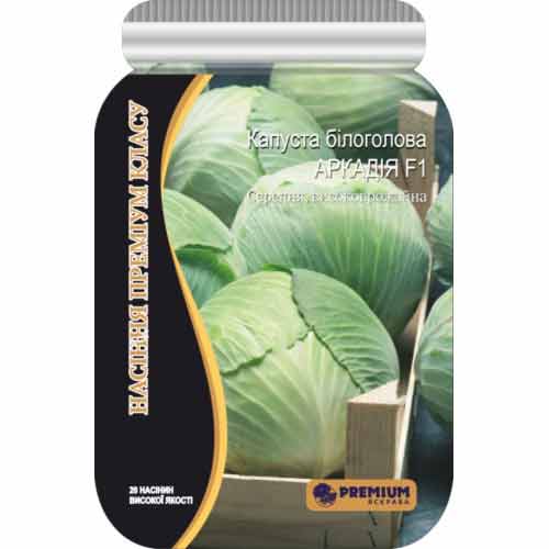 Капуста білоголова Аркадія F1 - середньостиглий гібрид. Качани у капусти великі, вагою від 3 до 4 кг. За формою головки круглі, однакового розміру. Термін дозрівання після висадки розсади становить від 85 до 90 днів. На грядках можна на час залишати неприбраний урожай, головки відмінно зберігаються без втрати зовнішнього вигляду і смакових якостей. Підвищена стійкість до фузаріозу і пошкодження трипсами.