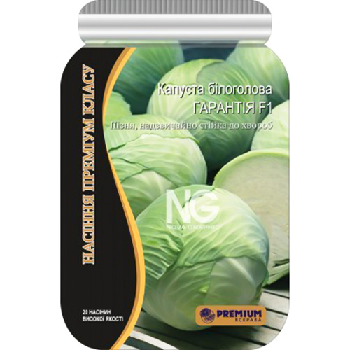 Капуста Гарантія F1 - пізньостиглий білоголовий гібрид, який призначений для тривалого зимового зберігання. Капуста формує головки 3 - 4 кг, іноді буває більшого розміру до 5 кг. З широкими покривними листками, темно зеленими з восковим нальотом. Качани щільні, білі всередині, соковиті. Урожайність - стабільна до 120 т / га. Збір врожаю капусти Гарантія починають через 120-135 днів після посадки 30-денної розсади. На відміну від аналогічних гібридів, володіє генетичною стійкістю до фузаріозного в'янення, слабо уражується трипсами, Відрізняється високою лежкістю. Капусту використовують для перероблювання та квашення. У нашому інтернет-магазині тільки якісне насіння та саджанці.