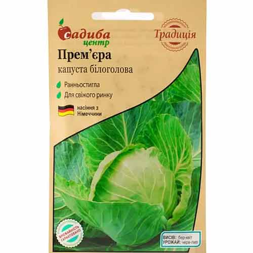 Капуста білоголова Прем'єра – ранній сорт із невеликими розетками листя діаметром 36-40 см. Формує округлі качани масою 0,8-2,5 кг із маленьким внутрішнім качанчиком. Від висадки розсади на постійне місце до збирання плодів проходить 50-55 діб. Сорт добре переносить низькі температури та стійкий до цвітушності.